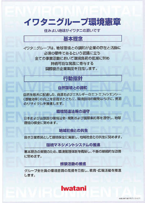 環(huán)境問題,不僅是防止產(chǎn)業(yè)公害,還有廢棄物、生活廢水造成的水質(zhì)污濁等問題,甚至還有地球變暖、臭氧層破壞等全球性規(guī)模的環(huán)境問題。為此,在遵守“巖谷集團(tuán)環(huán)境憲章”的同時,為取得更大的成果,也致力于強(qiáng)化組織、體制,同時提高員工的意識。