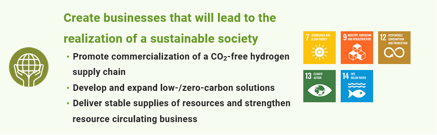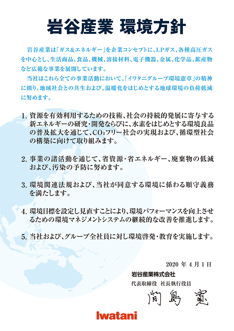 Under our slogan “Creation of a more comfortable space on the Earth is what Iwatani wishes and strives for,” Iwatani strives to achieve solutions to the social challenge of environmental issues and to realize the Sustainable Development Goals (SDGs) by realizing a zero-CO2 society based on hydrogen.